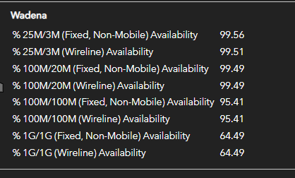 Wired (wireline) and wireless (fixed, non-mobile) served location percentage at various speeds.